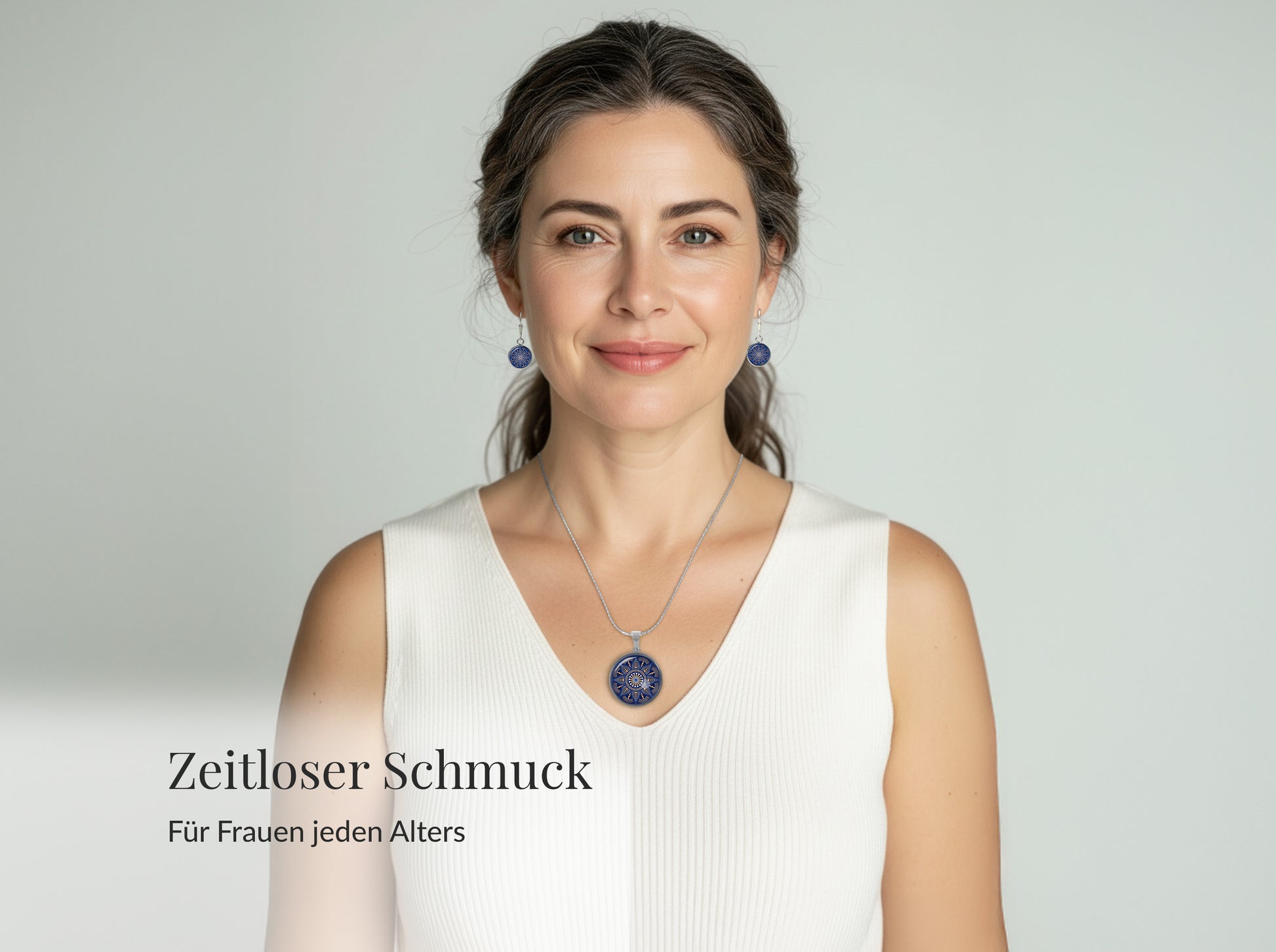 Zeitloses Mandala-Schmuckset in Blau aus Edelstahl. Elegant, spirituell und zeitlos – geeignet für Frauen jeden Alters. Lieferung in schöner Geschenkbox.