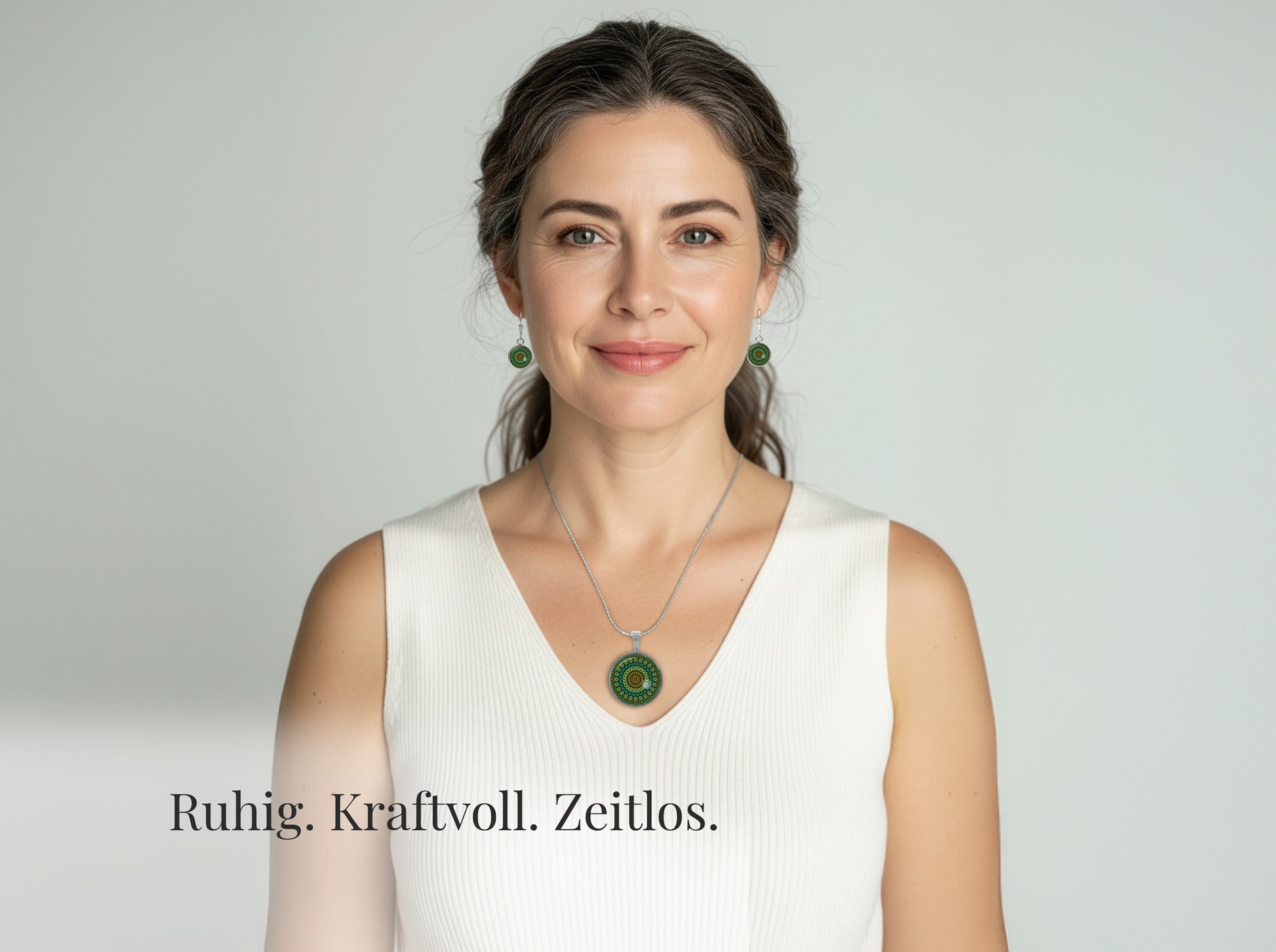 Dieses Mandala Schmuckset in kraftvollem Smaragdgrün verbindet Naturinspiration mit moderner Klarheit.