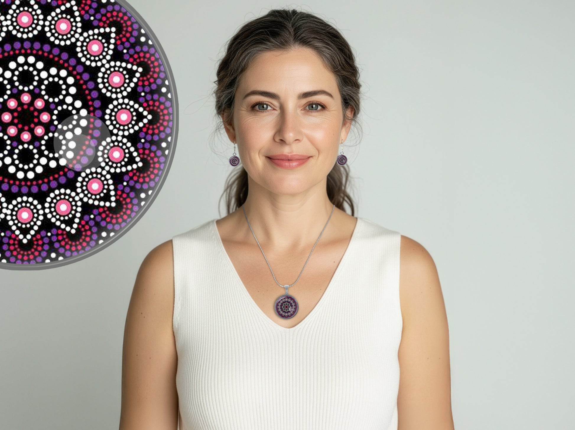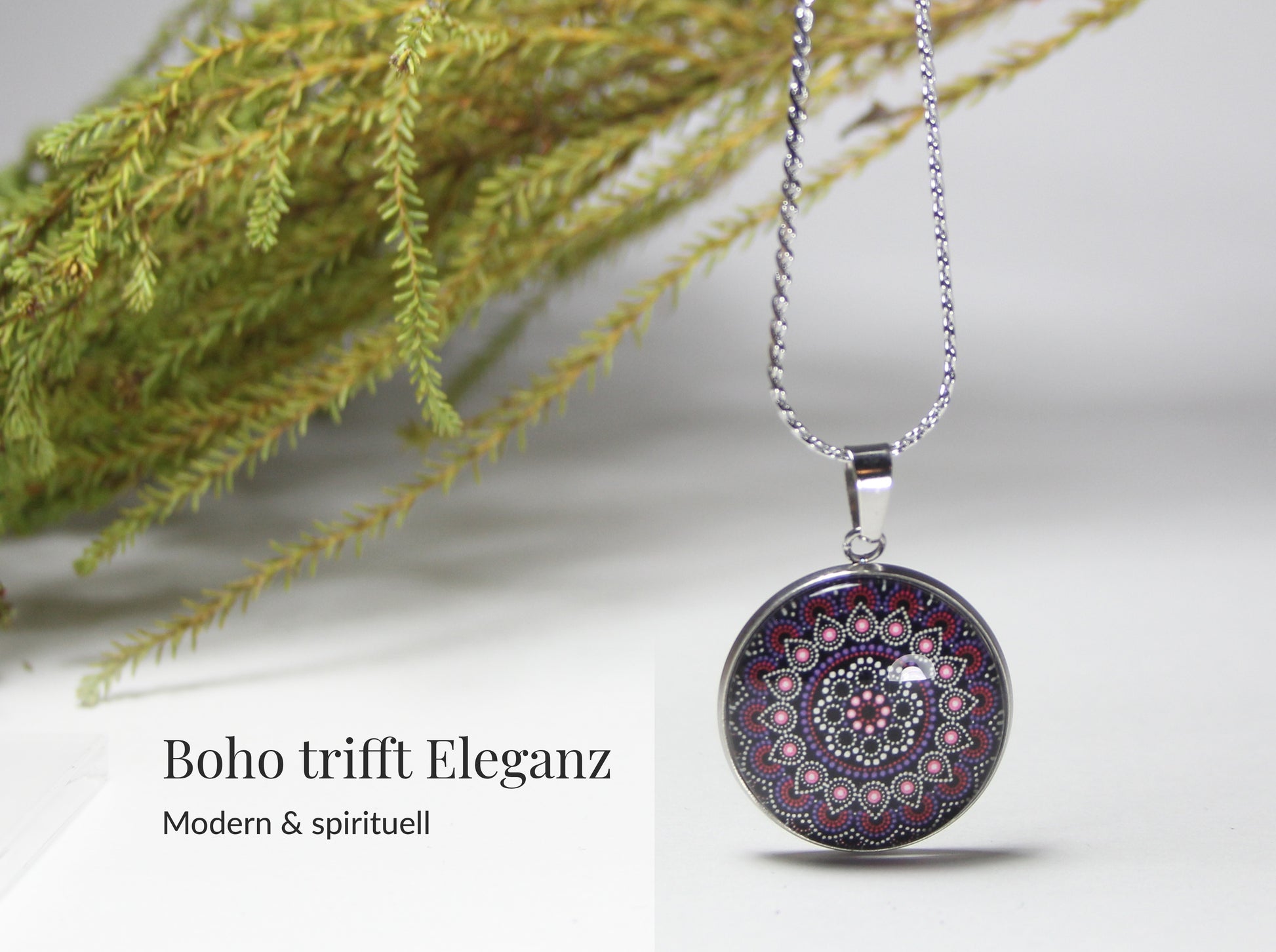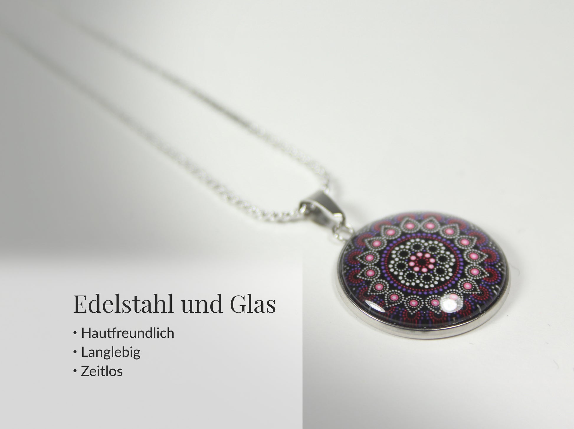 Dieses elegante Mandala Schmuckset in Violett und Pink vereint kunstvolle Dot-Art-Optik mit modernem Edelstahl-Design. Das detailreiche runde Mandala strahlt Harmonie, Tiefe und feminine Ausdruckskraft aus – ohne aufdringlich zu wirken.
